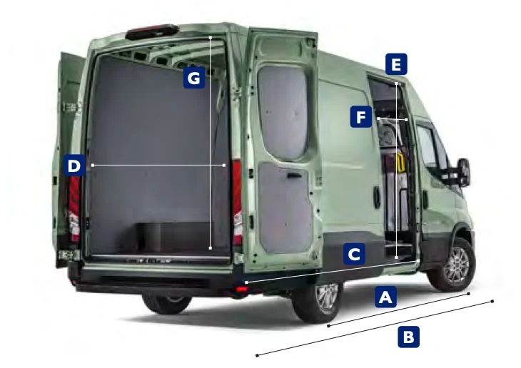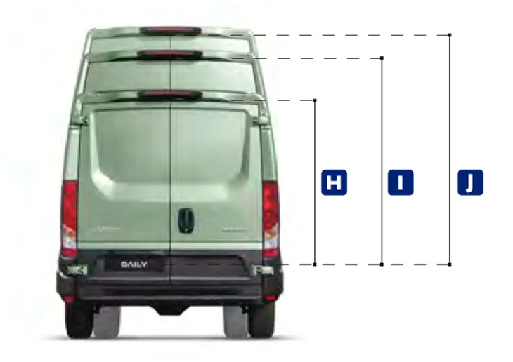 | A Колісна база (мм) | B Довжина автомобіля (мм) | C Довжина вантажного відсіку (мм) | D Ширина вантажного відсіку (мм) | H1 (1.545 мм) | H2 (1.900 мм) | H3 (2.100 мм) | Повна маса автомобіля (т) |