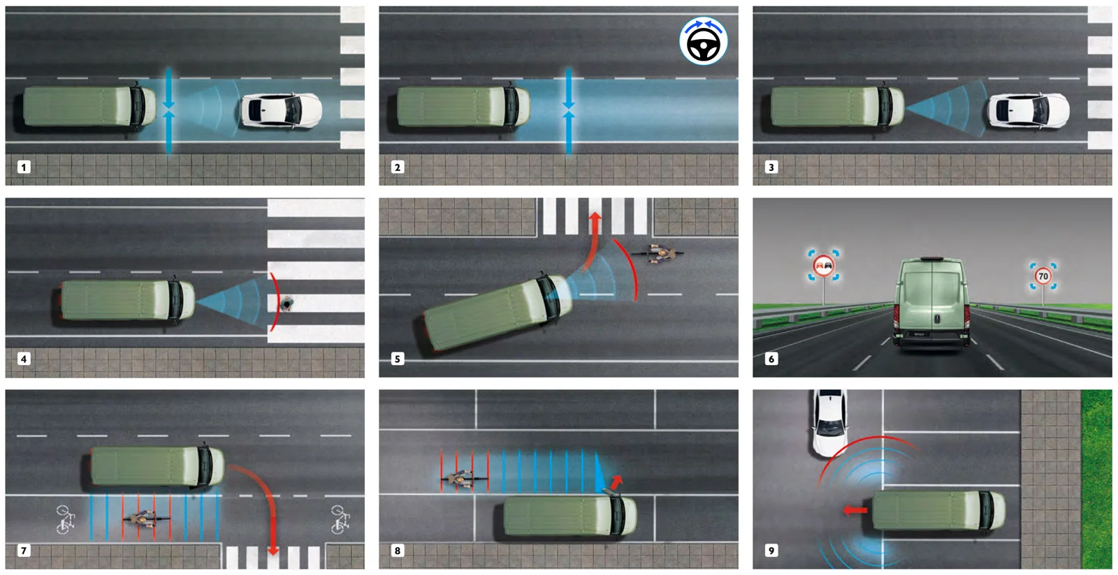 Безліч нових вдосконалених систем підтримки водія (ADAS) зроблять керування вашим Daily безпечним та легким - як на дорозі, так і в пробках або під час зупинки чи маневрування. Особливо це важливо для міських маршрутів, де вони допоможуть уникнути можливих зіткнень з пішоходами або велосипедистами.